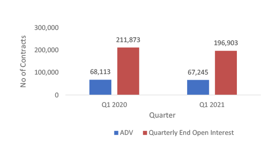 - However, the quarterly end open interest expand exponentially by 71.58% from 21,973 contracts in Q1 2020 to 37,701 contracts in Q1 2021.