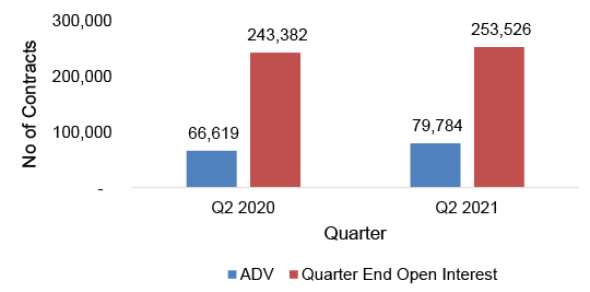 - While quarter-end open interest grew 4.17% from 243,382 contracts in Q2 2020 to 253,526 contracts in Q2 2021, the ADV had grown impressively around 19.76% from 66,619 contracts in Q2 2020 to 79,784 contracts in Q2 2021.