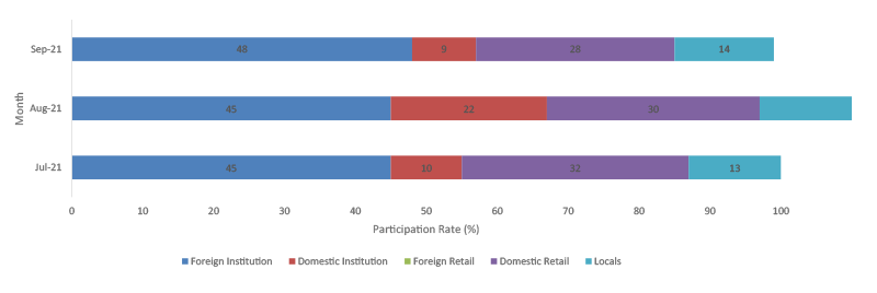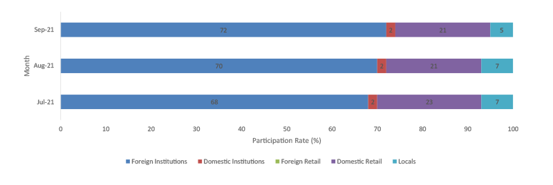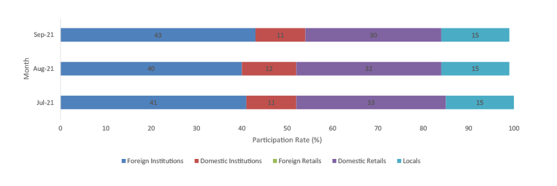 - The domination of foreign institution can be seen when they managed to continue to make up more than 40% of the market share in Q3 2021,while domestic retails were able to consistently constitute above 30% of the market share.