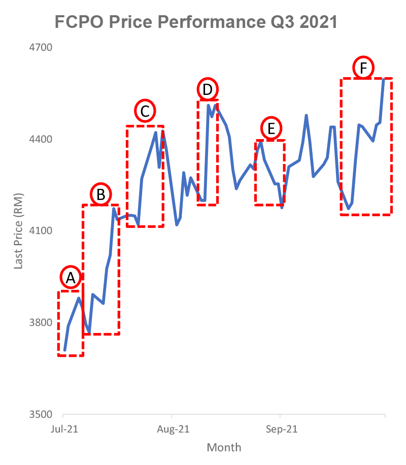 - On 30 September 2021, the benchmark Crude Palm Oil futures (FCPO) contract reached a new all-time high prices of RM 4,579/mt.